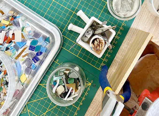 - La mosaïque moderne permet d’explorer en quelques heures son potentiel créatif en jouant avec une infinie palette de matériaux et couleurs (émaux, pâtes de verre, verre taillé, perles, cailloux, ciment coloré…).
